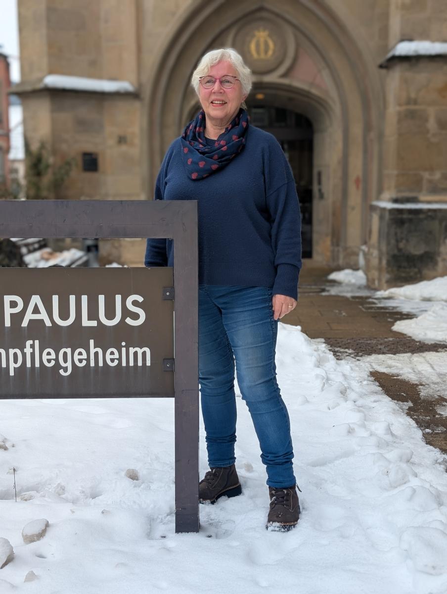 Wenn Eva Krüger durch die Türen des Altenpflegeheims St. Paulus geht, wirkt es ein bisschen so, als würde sie nach Hause kommen. Mitarbeiterinnen sprechen sie an, Gäste fragen nach dem Weg. „Ich bin in der Nachbarschaft aufgewachsen und wohne bis heute in Hildesheim“, erzählt sie. Bereits ihr Schulweg habe an der Ruine der alten Dominikanerkirche vorbeigeführt, die später zum Altenpflegeheim St. Paulus umgebaut wurde.