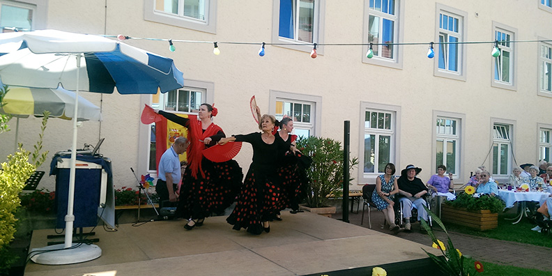 Angehörige, Bewohner, Mitarbeiter, Ordensschwestern und Freunde des Hauses waren zahlreich erschienen um gemeinsam zu feiert. Zu Beginn des Festes nutzte Heimleiterin Christiane Ernst die Gelegenheit um sich einmal bei allen ihren Mitarbeitern zu bedanken: „Ohne euch liefe hier gar nichts“. Danach spielte der Alleinunterhalter Willi Sitter zum Tanz auf und begeisterte die Anwesenden mit Liedern wie „Wenn bei Capri die rote Sonne im Meer versinkt“ und sogar spanische Hits wie „Amor, amor“ von Julio Iglesias hatte er in petto. Höhepunkt der Veranstaltung war die Flamencogruppe „Fleur de la Canela“ die die Zuschauer mit spanischen Tänzen begeisterte.