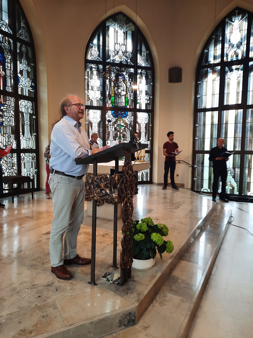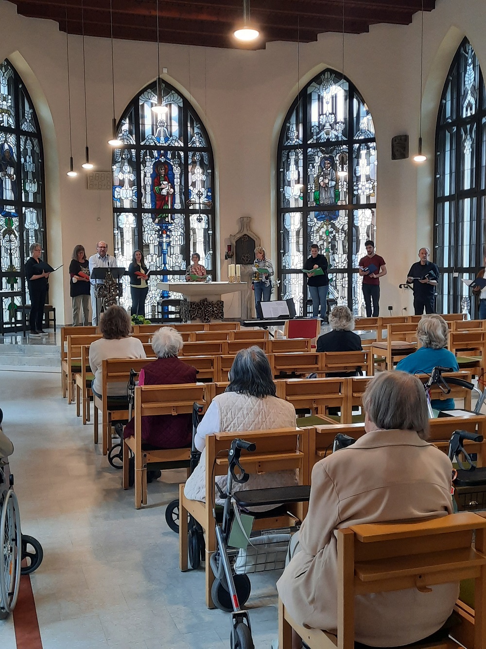 Auch wenn die Auflagen des Gesundheitsschutzes für ein Konzert im Altenpflegeheim noch immer hoch sind. Die Chormitglieder müssen am Empfang Test oder Impfausweis vorweisen und ihre Personalien hinterlassen. Die ersten Reihen in der Kapelle bleiben leer. Neun Sängerinnen und Sänger stehen im weiten Halbkreis, Thomas Viezens begleitet am Keyboard und dirigiert. Vorgetragen werden weltliche und geistliche Lieder, insbesondere in die bekannten Choräle fallen die Seniorinnen und Senioren ein. Etwa in das für die Communauté de Taizé komponierte „Laudate omnes gentes“ sowie in den Segenswunsch „Komm, Herr, segne uns“.