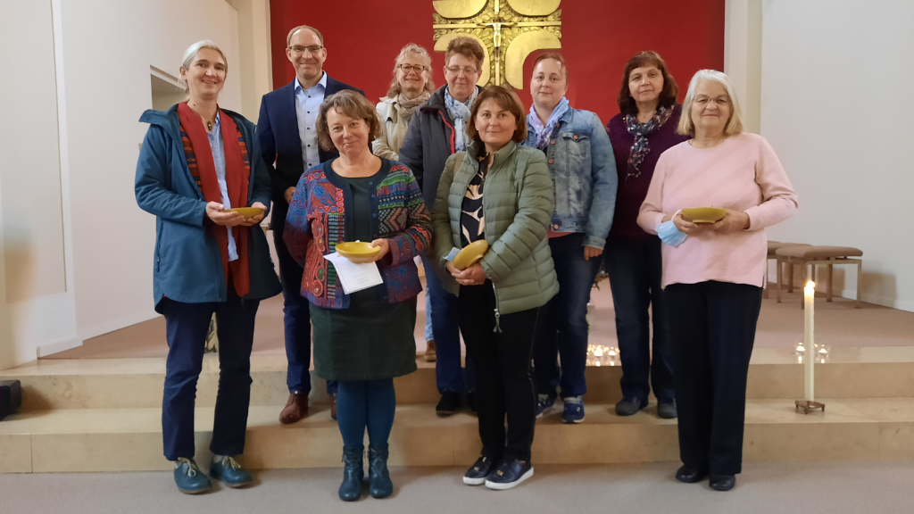 Die Mitarbeiterinnen und Mitarbeiter bekamen während der Andacht ein Geschenk überreicht: einer Tonschale aus der französischen, ökumenischen Gemeinschaft Taizé.