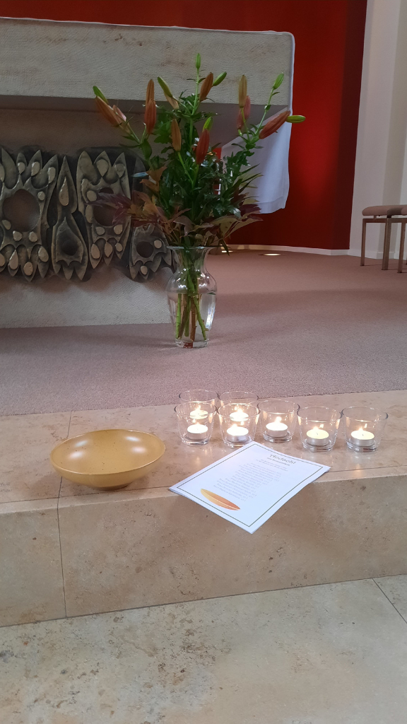 Generalvikarin Schwester M. Hanna Schmaus führte durch die Andacht und begleitete auf ihrer Gitarre Lieder wie „Du bist das Leben“ und „Keinen Tag soll es geben“. In ihrem geistlichen Impuls ging es um das Gefühl der Überforderung, das in dieser Zeit überlappender Krisen viele Menschen erlebten. „Die Situation gerade in der Pflege wird immer schwieriger“, so Schwester Hanna. Bei vielen Kolleg*innen gebe es das Gefühl, die Kraft sei aufgebraucht. „Das Gefäß ist leer, so fühlt es sich an und, um ehrlich zu sein, weiß ich nicht, wie es wieder zu füllen ist.“ Sie könne nur einladen, einen Moment innezuhalten, sich auf die Gebetstexte einzulassen und ein wenig geschenkte Zeit im Miteinander zu erleben.