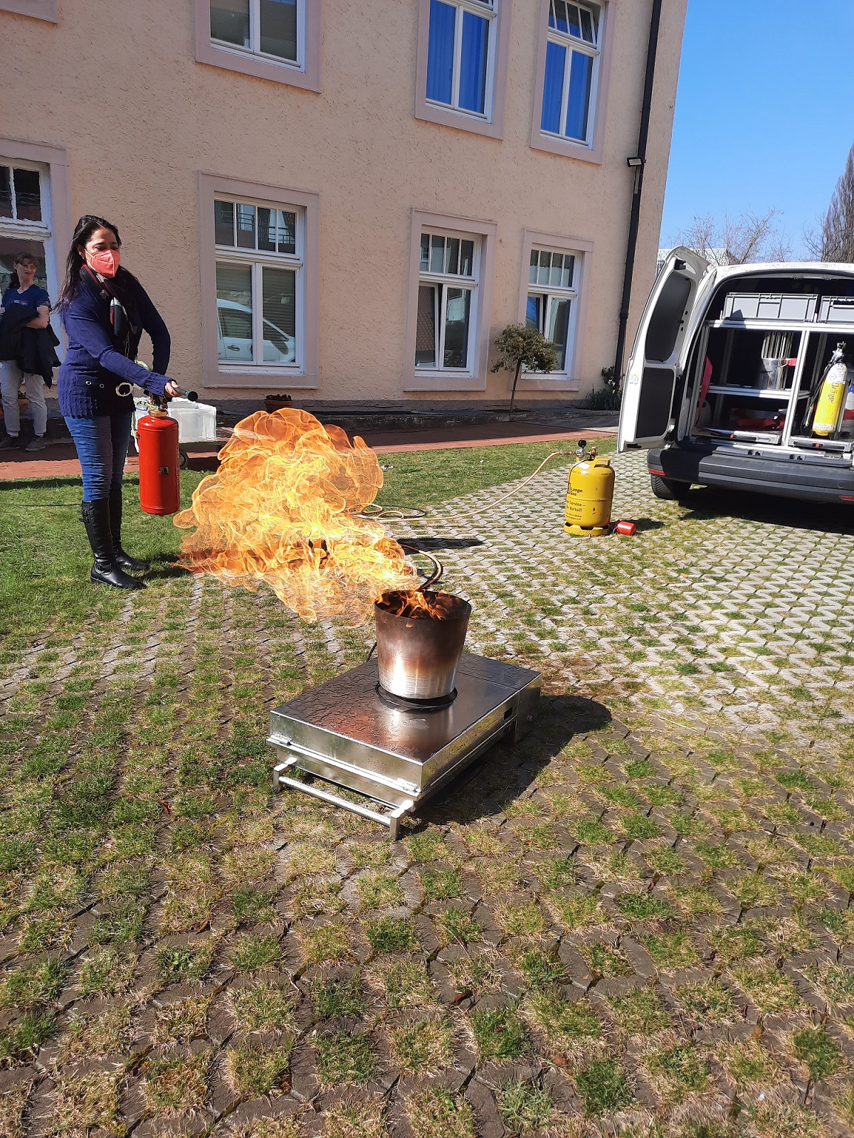 Höhepunkt: Eine Brandschutzübung im Garten, bei der alle Teilnehmenden ein Feuer in einem sogenannten Fire Trainer löschen durften. Auf dem Bild sehen Sie unsere Kollegin Frau Gündüz.
