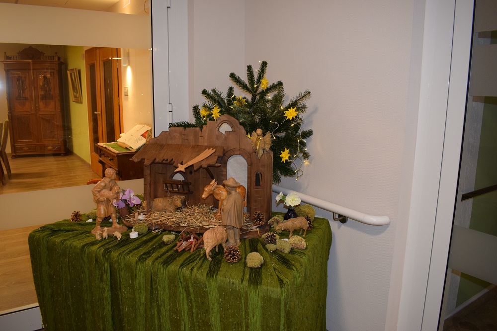 Weihnachten! Der Duft von Tannen, Kerzen und Gebäck schafft für unsere Bewohnerinnen und Bewohner ein Stück Geborgenheit. Es ist ein Herzensanliegen unserer Mitarbeiterinnen und Mitarbeiter, das Haus festlich zu schmücken. Eine Krippe taucht an der Kapelle auf, Sterne glitzern in den Gemeinschaftsräumen, Tannenzweige duften und piksen sanft auf den Tischen im Speisesaal.