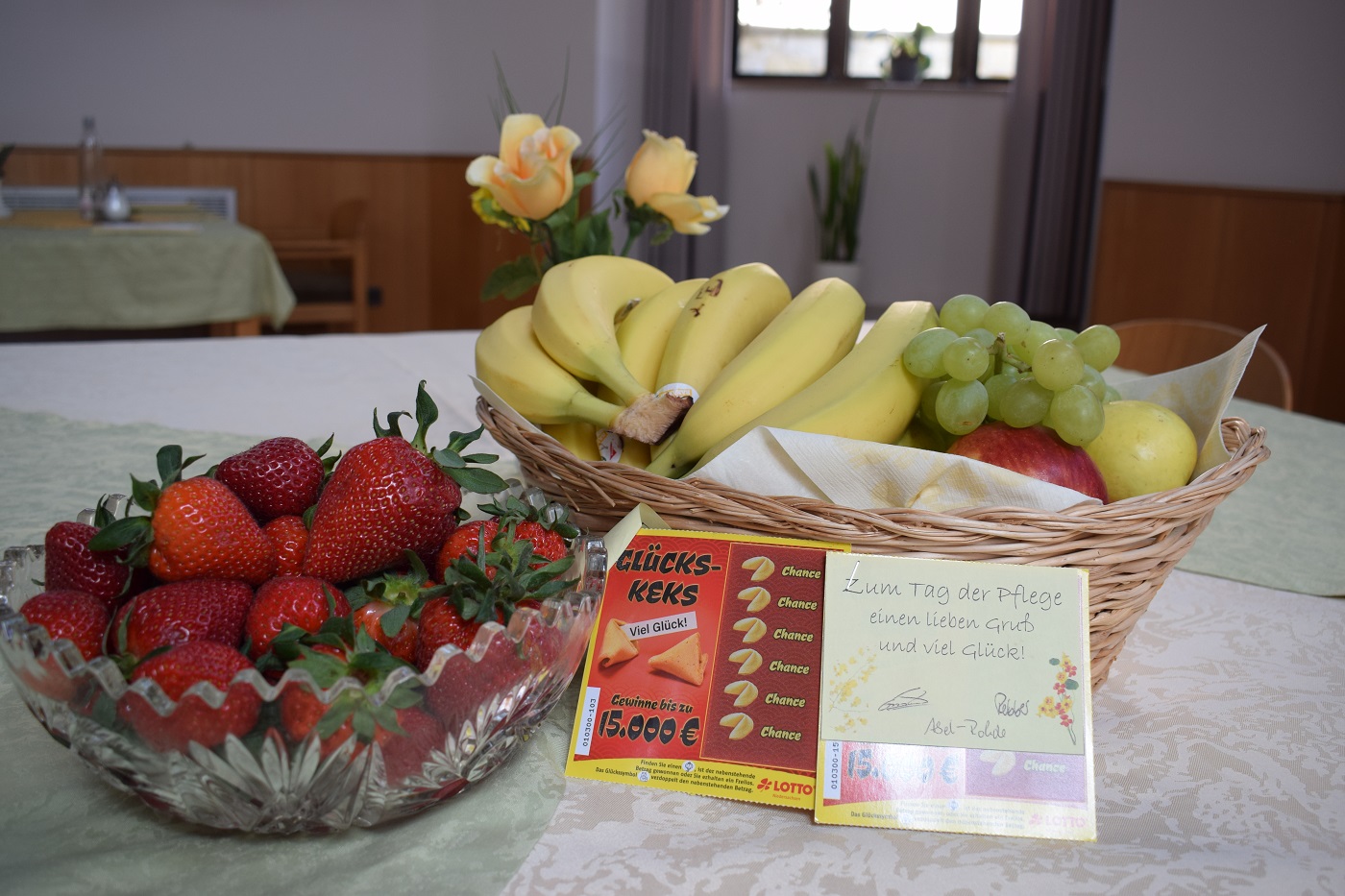 Glückskekse und frische Erdbeeren: Ein kleiner Gruß von der Heimleitung und der Pflegedienstleitung an alle Mitarbeiterinnen und Mitarbeiter unseres Altenpflegeheims.
