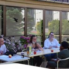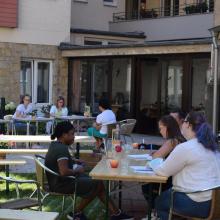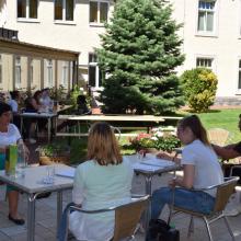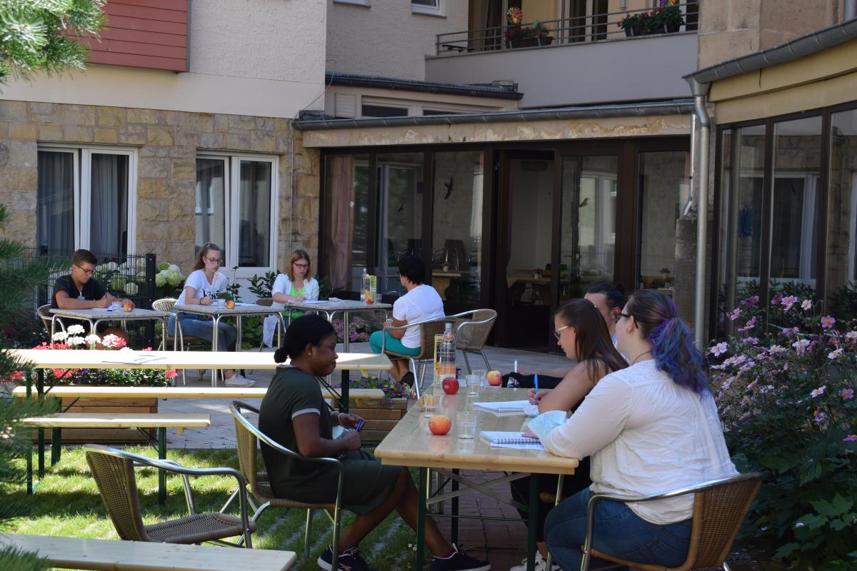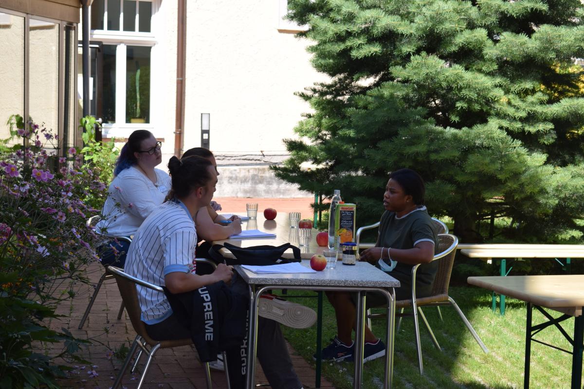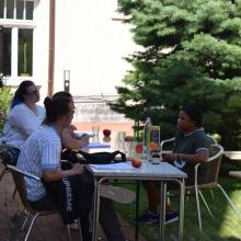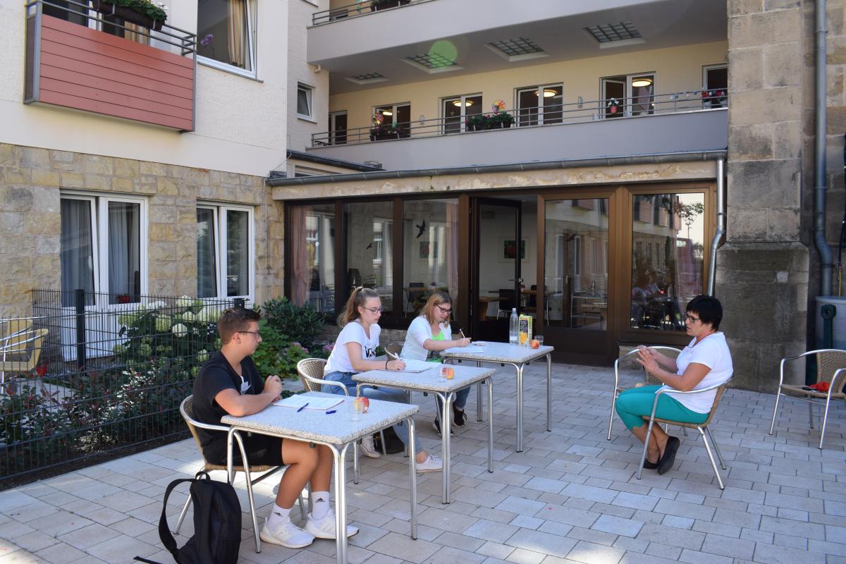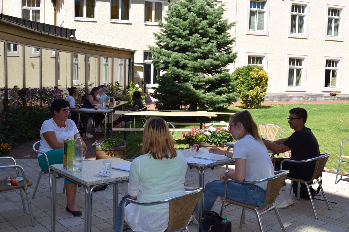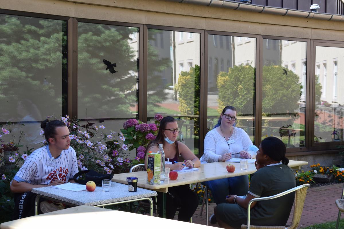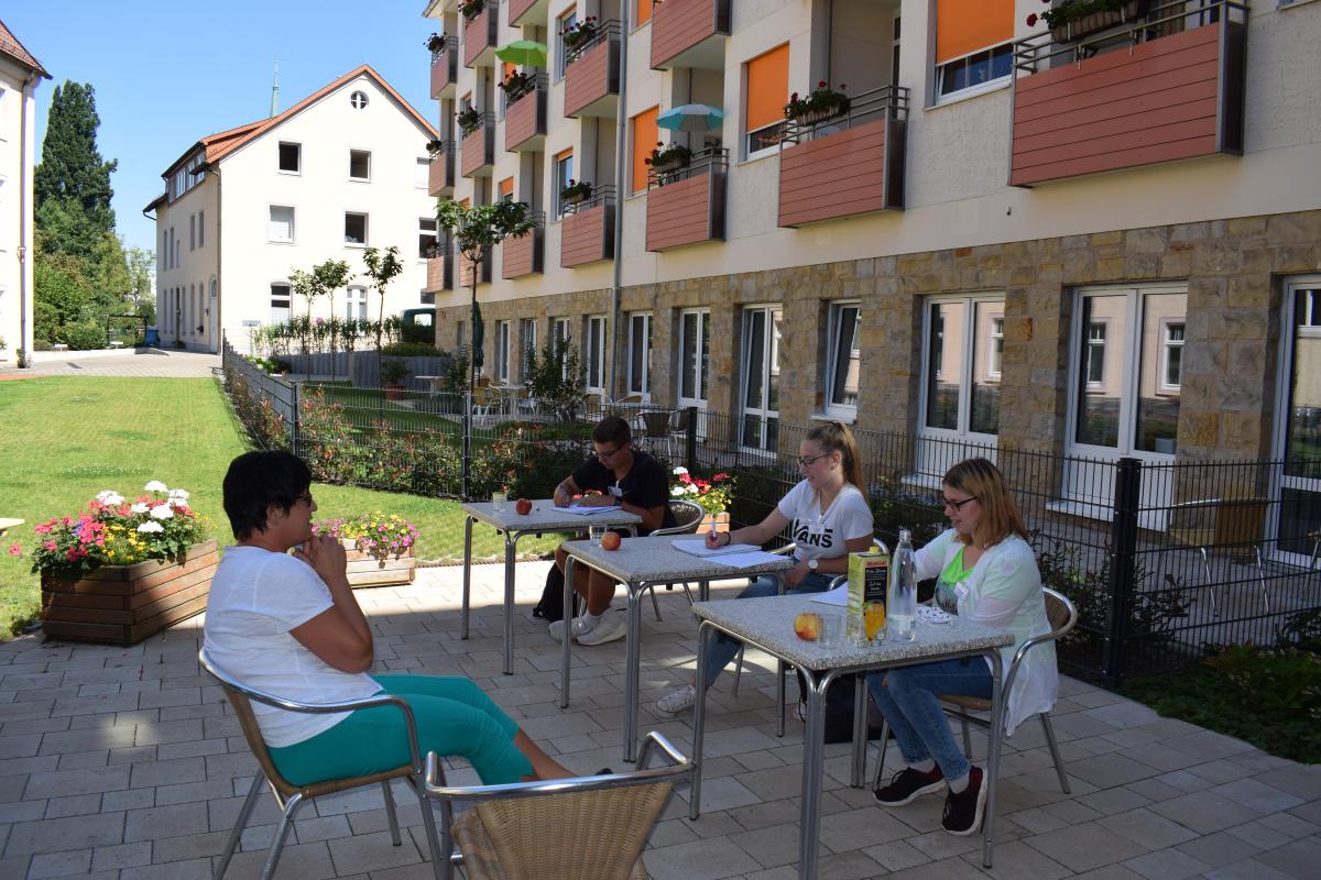 "Ist dieser Beruf, der Beruf den Sie am liebsten erlernen wollten?" So lautete eine der ersten Fragen, die die neuen Auszubildenden des Ausbildungszentrums am St. Bernward Krankenhaus Hildesheim den Pflegefachkräften des Paulusheims gestellt haben. Frau Agnieszka Latta und Frau Khaddy Camara haben sich als Interviewpartnerinnen am vergangenen Donnerstag im Gartenbereich des St. Paulusheims zur Verfügung gestellt. Sechs Auszubildende hatten so die Gelegenheit, sich anhand eines selbst erarbeiteten Fragebogens ein eigenes Bild von einem pflegerischen Beruf zu machen. Frau Latta, die ihre Ausbildung im ambulanten Pflegebereich absolviert hat, arbeitet seit letztem Jahr als Pflegefachkraft im St. Paulus Altenpflegeheim. Ihre Kollegin Frau Camara hat ihre Ausbildung bei uns im Altenpflegeheim gemacht und ist seit 01.09.2017 als Fachkraft fest bei uns beschäftigt. Die jungen Nachwuchskräfte nutzten die Gelegenheit, um allerlei Fragen zu stellen und waren sehr interessiert, was die beiden Pflegefachkräfte zu berichten hatten. Schnell ergab sich zwischen den Interviewpartnern ein aufgeschlossenes und lockeres Gespräch. Zu den häufig gestellten Fragen gehörten u.a. ob die beiden Mitarbeiterinnen den Beruf wieder erlernen würden, was sie sich für die alltägliche Arbeit wünschen und auch wie Vorgesetzte auf sie persönlich eingehen. So konnten die jungen Nachwuchskräfte berteits einen ersten Einblick in den Berufsalltag einer Pflegefachkraft erhalten und sicherlich wertvolle Tipps von Frau Latta und Frau Camara für ihre Ausbildung mitnehmen. Wir wünschen allen neuen Auszubildenden weiterhin einen erfolgreichen Start in ihre berufliche Zukunft!