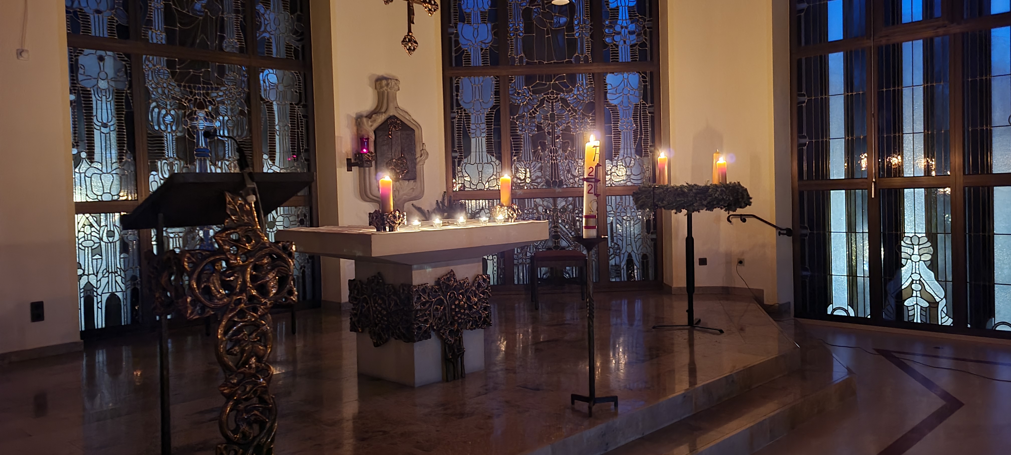 In der Kapelle unseres Altenpflegeheims wurde heute eine Lichtfeier angeboten. Die Andacht begann mit dem traditionsreichen Adventslied „Wir sagen Euch an den lieben Advent“. Dann wurde das Licht in der Kapelle ausgeschaltet und eine brennende Osterkerze erhellte den Raum.