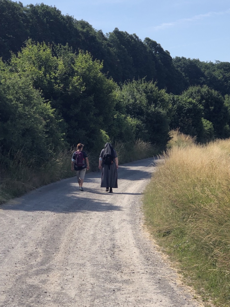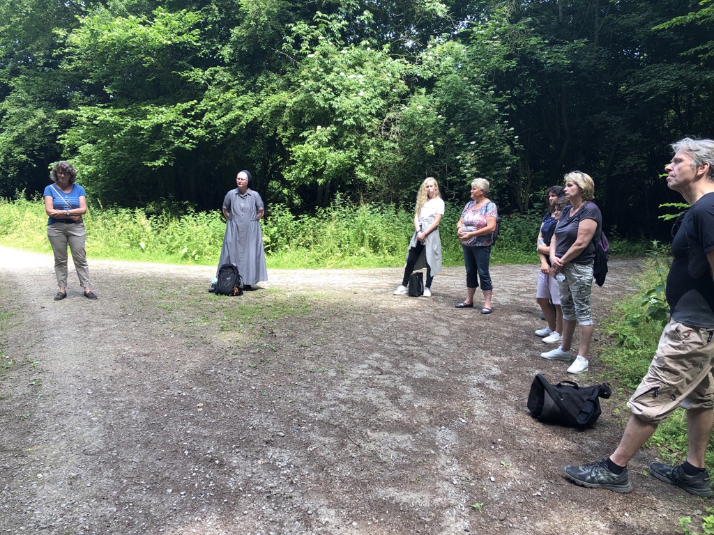Unterwegs auf dem Kreuzberg in Ottbergen: Das Wahrnehmen der Schöpfung mit allen Sinnen - einfach nur so, ohne Verpflichtung - war Freude und Erholung für unsere Mitarbeiter*innen. So brachte Schwester Hanna den Sonnengesang des Hl. Franziskus von Assisi während der Wanderung als Inspiration ein. Zum Abschluss fand sich die Runde an der Wallfahrtskapelle des Kreuzberges zusammen.