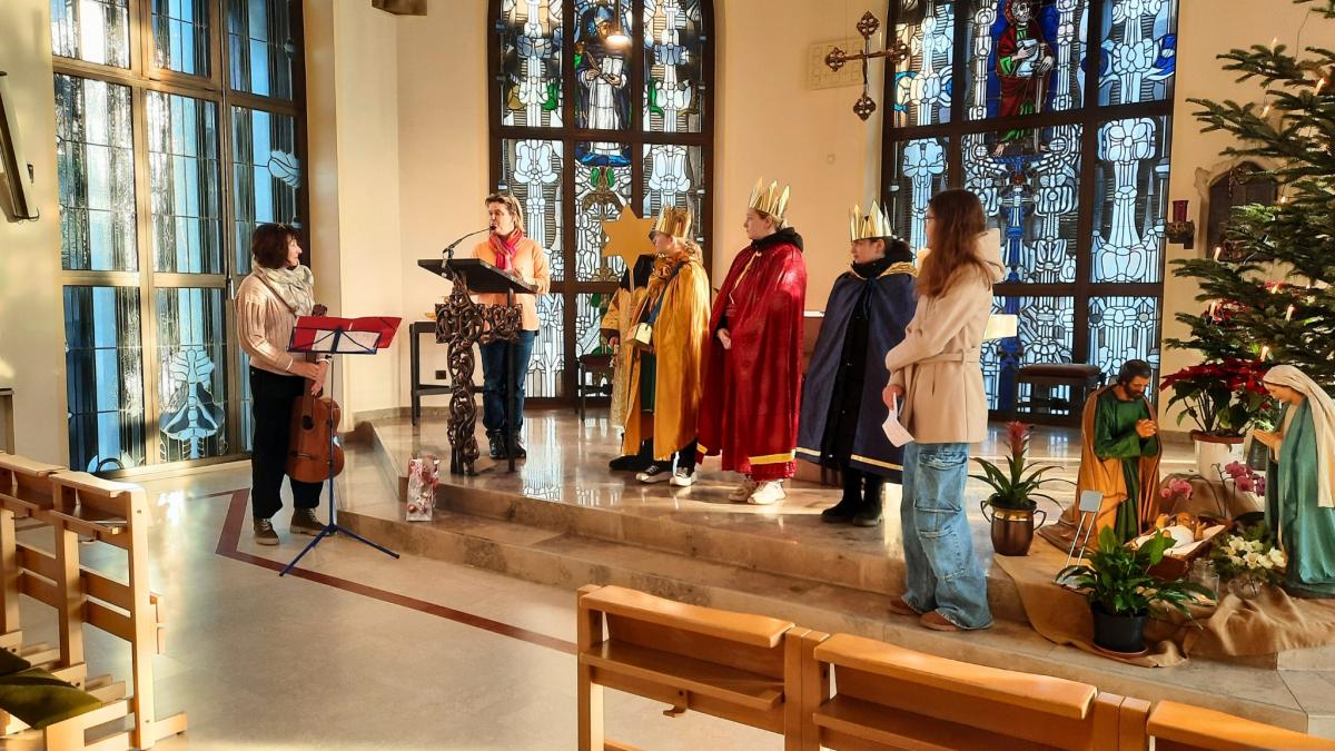 Am Dienstag, 9. Januar, waren Sternsinger der St. Augustinus Schule im Altenpflegeheim St. Paulus der Vinzentinerinnen Hildesheim zu Gast. Und die Heiligen Drei Könige hatten Verstärkung mitgebracht. In der festlichen Kapelle des Altenpflegeheims St. Paulus trugen Mia aus der 6a (Balthasar), Lana (6a, Melchior) und Victoria (5c, Caspar) ihre Segenswünsche vor. Unterstützt wurden sie dabei von Zoe (5b) als Sternträgerin sowie Achtklässlerin Nele und Lehrerin Regine Hufner, die die Sternsinger auf der Gitarre begleitete.