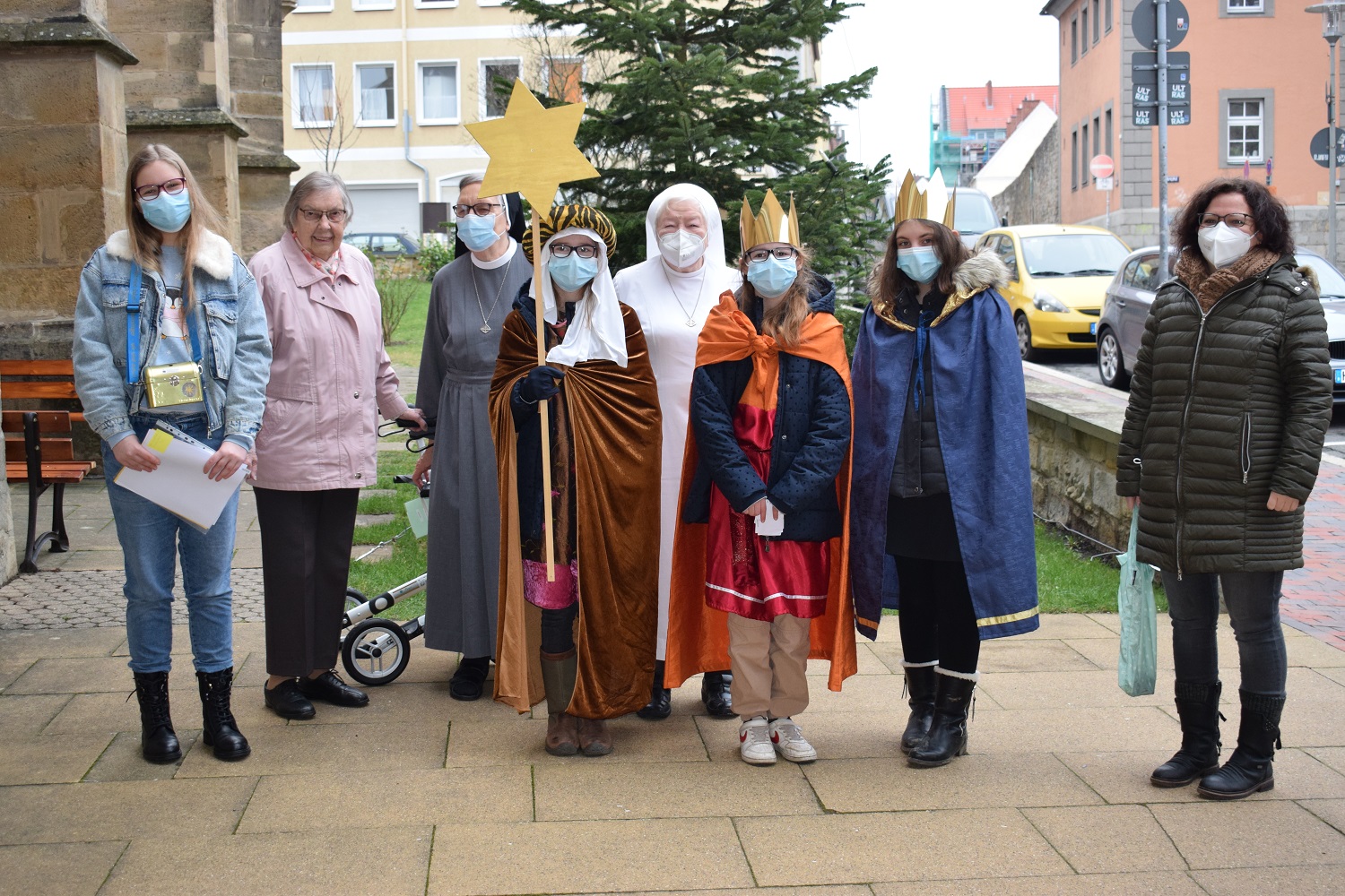 Vor dem Eingang des Paulusheims übergaben Frau Schmidt, Schwester Andrea und Schwester Benitia stellvertretend für alle Bewohnerinnen und Bewohner die Spende an die Sternsinger.